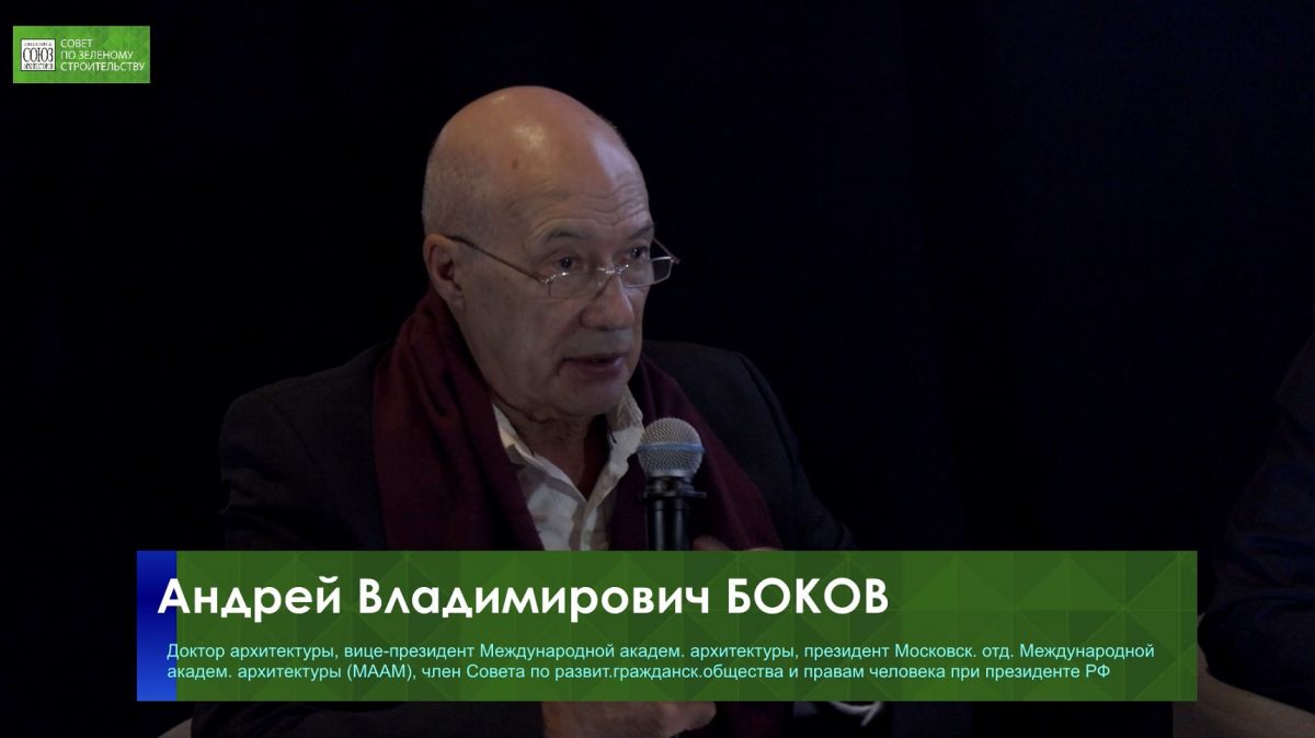 Далее Андрей Боков подробно рассказал об устойчивом развитии, основанном на 17 принципах, основу которых составляет триада: экономика, экология и социология. Именно они подарили одну важную методологическую норму: мы все должны стремиться к балансу и равновесию интересов различных сил, искать состояния, которые обеспечивают устойчивость. На сегодня ситуации с «Зелёным строительством» является заботой государства: бюрократов и чиновников. «Помню ещё перед Олимпиадой 2014 года вся сертификация олимпийских сооружений была одной из главных. Тогда по мнению многих экспертов, наша страна должна была иметь свою систему зелёных сертификаций, опираясь на уже известные: LEED, BREAM, DGNB, став заботой государства. Но, к сожалению, состояние идеологии и экологически ориентированного подхода в нашей стране находится примерно в той же точке, что 15 лет тому назад», что не скажешь про цифровизацию, именно тут мы чрезвычайно успешны и являемся лидерами на гребне прогресса», заключил архитектор.